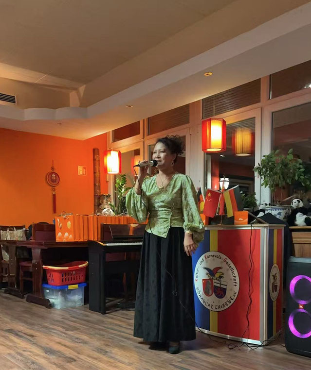 文艺演出环节,德国文德书院院长王莉首先介绍了波恩嘉年华协会主要创办人、全德华人华侨联合总会执行主席金建书先生对德国纪念孔子诞辰公益文化活动所给予的热情支持。王莉院长表示,虽然金主席因故未能亲自出席今年9月28日的德国祭孔典礼,但她与学生子琳特意为此次中秋晚会准备了两个源自2025年纪念孔子诞辰活动的节目,以表达敬意与传承。