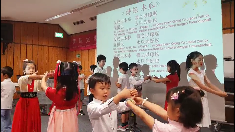 之后,孩子们一起声情并茂地吟唱周代《诗经·国风·卫风·木瓜》并表演礼仪,生动演绎了中华民族礼尚往来、珍视情谊的传统美德。