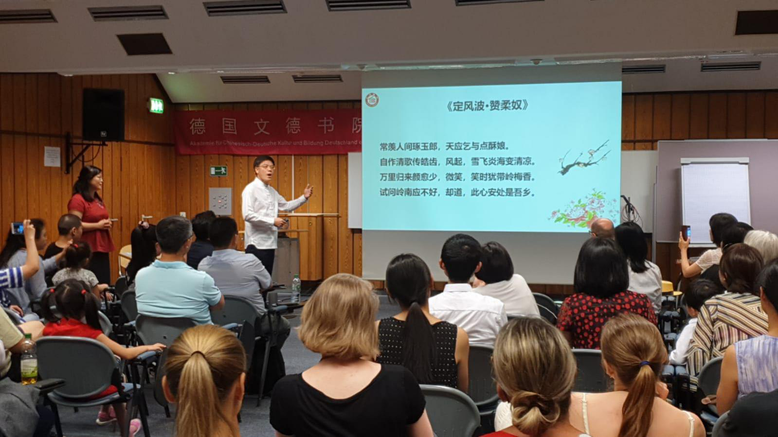最后,孔院长教现场的听众们一起吟诵苏轼的《定风波·赞柔奴》,吟完“此心安处是吾乡”,他意味深长地说:“心安的地方就是我的家乡,我和王教授在这里心很安,科隆是我们的故乡。”话音刚落,会场响起了雷鸣般的掌声!